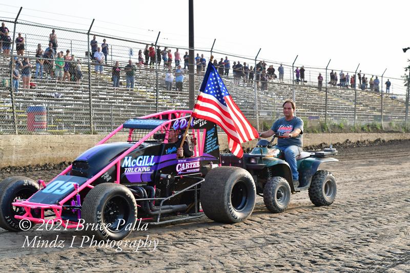 Greg Olsen of Round Lake Heights, IL took second in a hard fought battle with third place finishing Jimmy Sivia of Winthrop Harbor, IL. Trevor's Chris Dodd was fourth. Kansasville's Ryan Marshall, who started 20th in the 24-car field after winning one of the "B" Mains, shot through the field to pick up fifth.